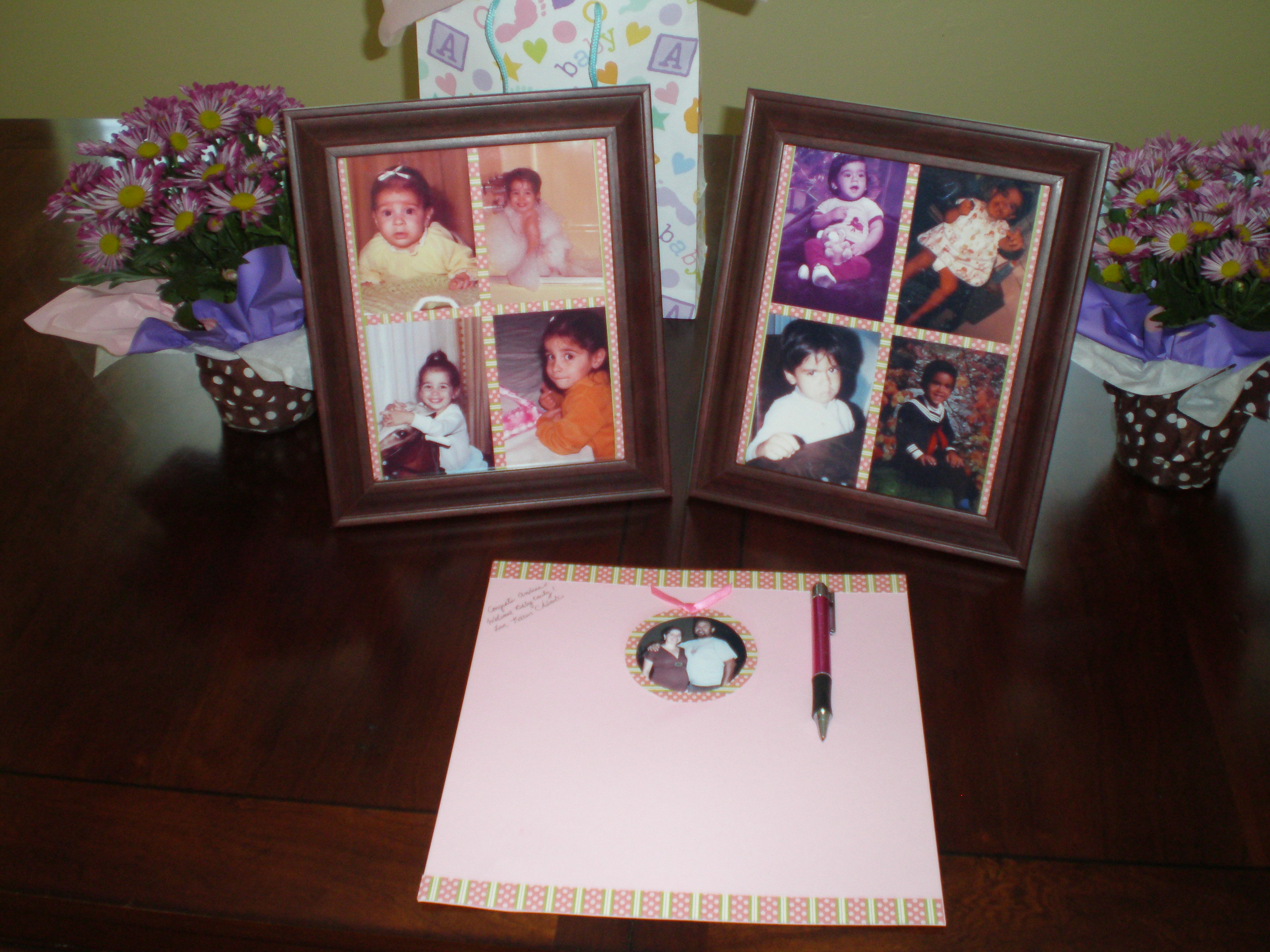 I really liked this display the other hostess, Karen, set up using baby pictures of my husband and me. We used this same display in my other baby shower. She included a blank scrapbook page that the guests signed. I’ve put it in Emily’s scrapbook and it’s so wonderful to read all of the touching messages.