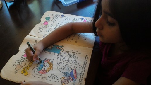 So far, I’ve only allowed her to play with the Pound Puppies, Barbie, the tree house, Strawberry Shortcake, and the coloring book. Flipping through the coloring book, we found a page that I had filled out 31 years before, to the day! She couldn’t quite wrap her young mind around the idea of me as a little girl 31 years ago, but I had goosebumps! It was the oddest sensation to see my scribbled handwriting and faded coloring, and to realize that the date was exactly the same! A genuine moment of déjà vu!