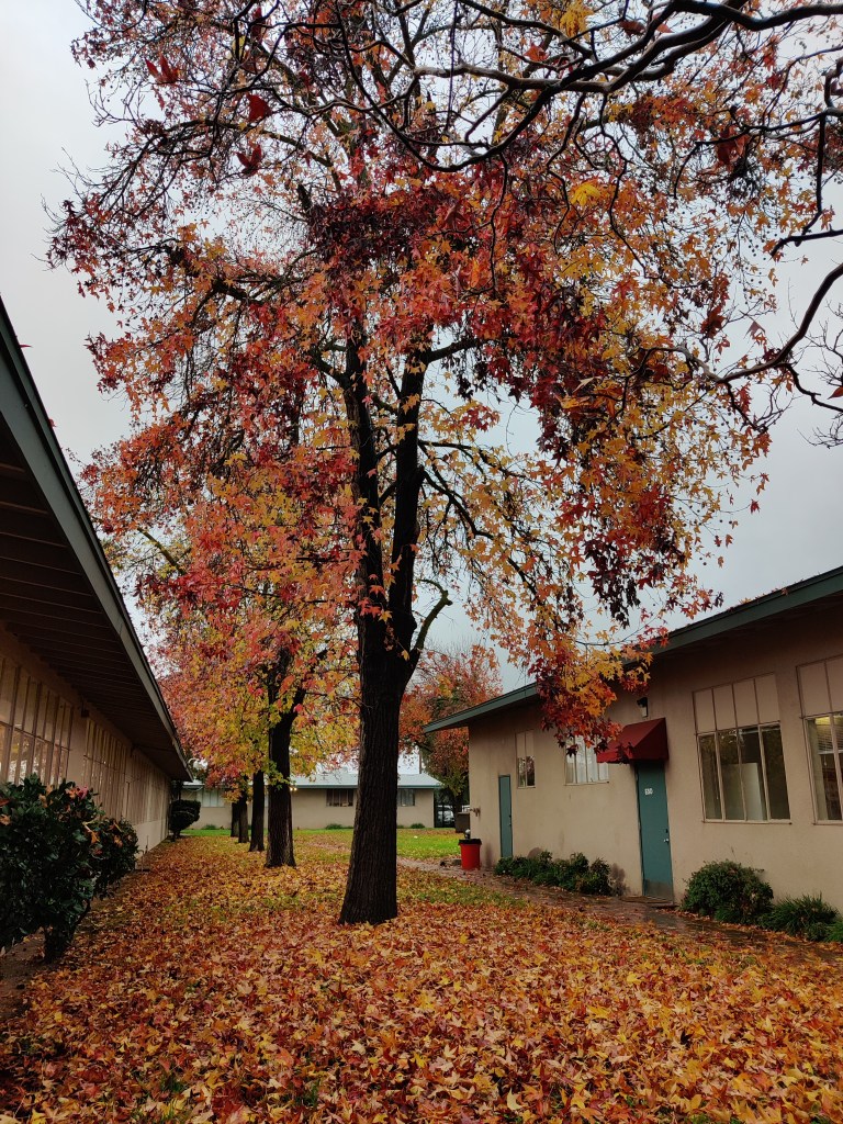 The photo doesn’t quite do it justice. With the much-needed rain and brightly colored leaves, everything looks so beautiful and peaceful out there. Meanwhile, inside my classroom, things are not quite so beautiful and peaceful due to the fact that the students must stay indoors. They’re understandably restless. I don’t blame them.