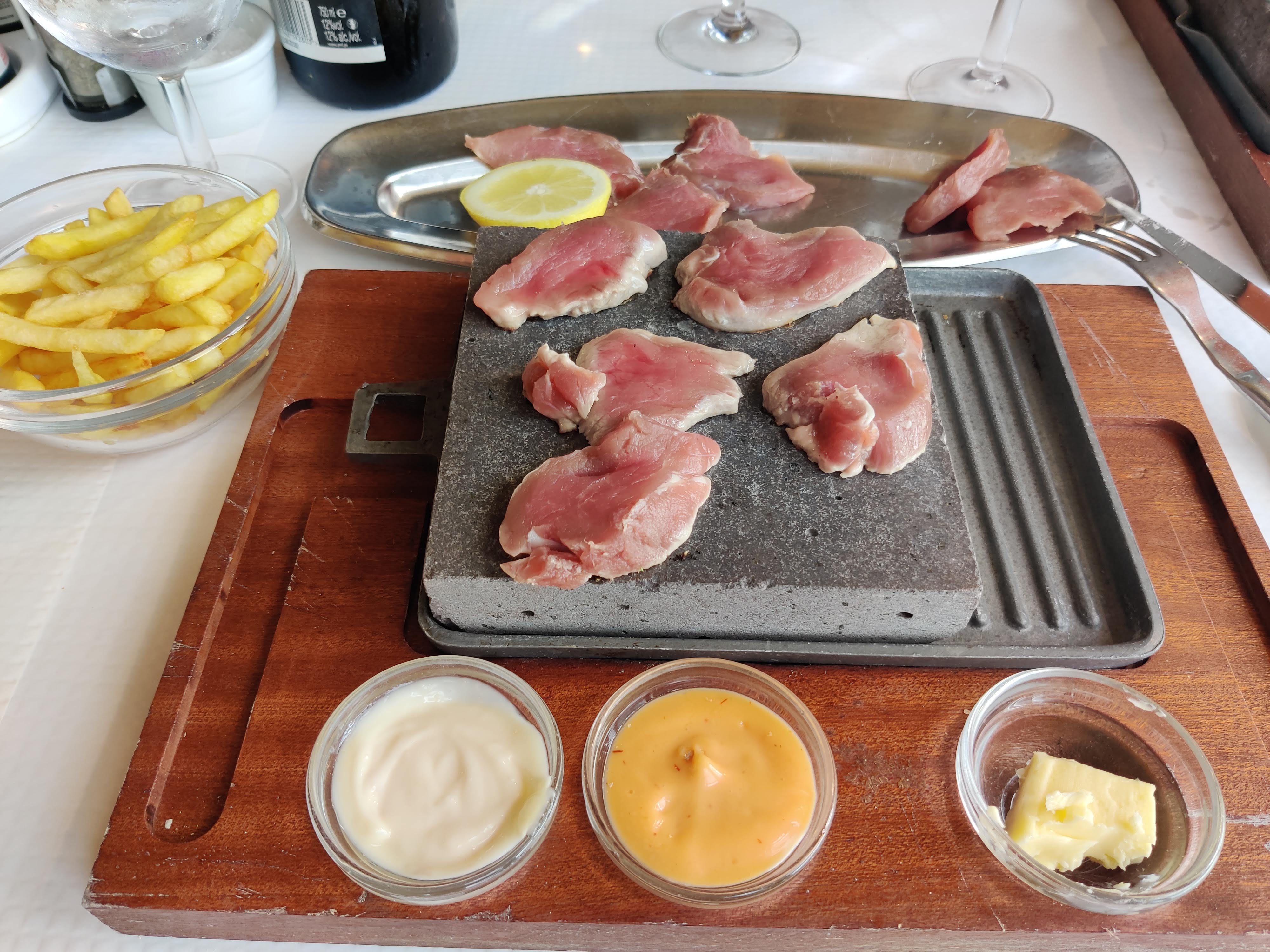 Time for some photos of food. The photo on the left is a bit cluttered, sorry about that. We ordered a lot of food! I truly enjoyed the chouriço à bombeiro, which is a regional sausage flame-grilled on a traditional red clay pot called an assador de barro. The aroma of the roasting meat was amazing! Paired with a refreshing caipirinha, it was heaven! As for the photo on the right, we went to a restaurant where they brought out a heated lava stone and we cooked meat on it. A bit more work for us, but it was all very tasty. You can also see french fries in the photo. Not sure how they found their way to the islands, but almost every meal we had in the Azores included french fries. Likely it’s because potatoes are a staple of their diet.